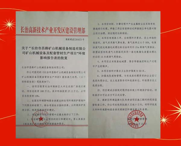 榮獲長治高新區環境影響報告表的批復