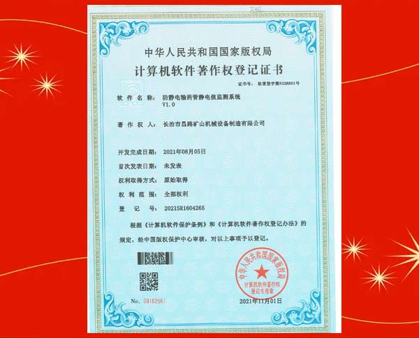 防靜電輸藥管搞破裂能力控制系統著作權登記證書